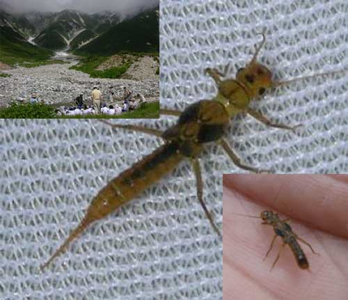 源流部は水生生物には過酷な条件なので昨年行わなかった調査を念のため今年は実施し、写真の水生昆虫(約1cm)を発見しました。黒部川での調査では見つからない種なので名前はわかりません。どなたか教えていただけませんか。