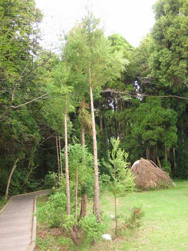 杉沢の沢スギは現在林内の立入を禁止しているが、自然館と森の間に植えられたスギもまた沢スギの特徴が現れていた。昔のように伏条更新させるために人の手によって親木の根元から伸びる枝の上に石が置いてあるのだ。写真右側の小さなスギが根付くのを見守りたいものだ。