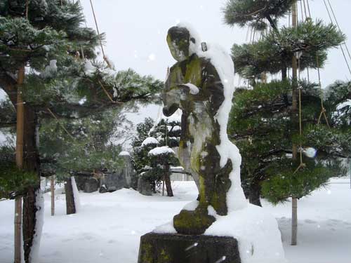 12月9日から降り始めた積雪は各種交通機関に混乱をもたらした。 小学校の庭に立つ二ノ宮金次郎少年が背負った薪にも雪が降り積もり、苦学する姿が一段と感じられ痛々しい。(地域学芸員より)