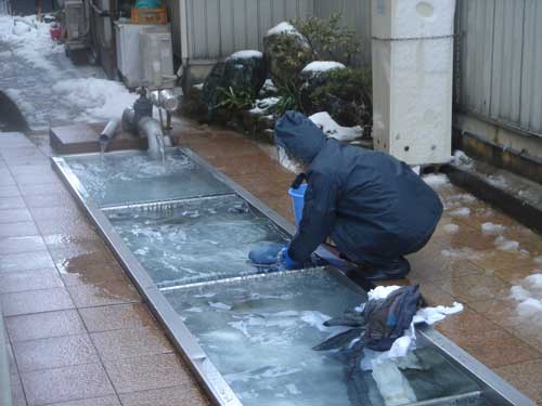 カッパを着ながら清水で洗濯する姿を見かけた。見た目は非常に冷たそうだが、清水の温度は一年を通して12度程度と一定なので、この時期は暖かく感じる程だ。(地域学芸員より)