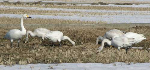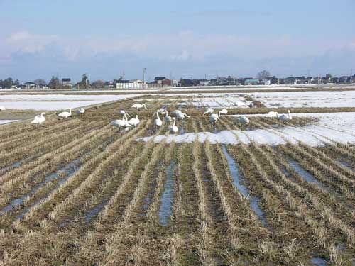 12月半ばから寒波をもたらした記録的な豪雪も1月半ばでようやく平年並みに落ち着いてきた。海に近いこのあたりの雪は、降り止むと山に向かって急速に消え始める。 越の湖跡の湿地帯に白鳥が飛来しているらしいとのうわさは聞いていたが偶然五郎八の田圃で四十羽を超えるコロニーと出会えた。雪が消えたばかりのコンバインが回った水溜りで落穂を探していた。(地域学芸員より) ![]() "夢中になって食餌しているように見えるが一羽は近づいた人をしっかり監視している。" 翌日、道具をそろえて撮影に向かったが、寒波襲来で氷点下の新雪に覆われ銀世界に変わった田圃には白鳥の姿は見えなかった。 |