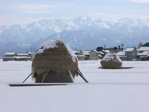 大変珍しくなった藁にお(一般には藁小積み?)を、入善で見つけることができた。雪原からひょっこり出ている藁帽子に見えて可愛らしい。たぶん、ジャンボスイカで藁を使うために作られたのだろう。(地域学芸員より)