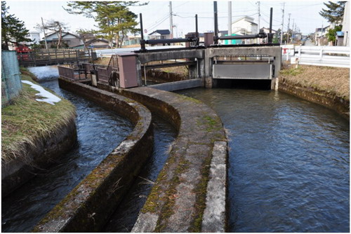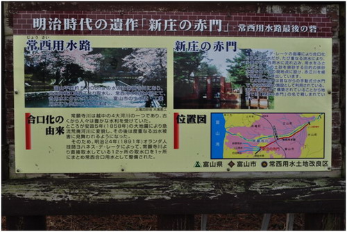 常西合口用水には、常願寺川から流入する土砂を除くために、排砂水門が設けられています。明治33年に完成した排砂水門は赤レンガで造られているので、地元では「新庄の赤門」の名で親しまれ、平成5年に修理後も現役の施設として、昔ながらの手動式で水を分水しているそうです。常願寺川の氾濫で、大量の土砂が合口用水に流れ込んだため、排砂水門により土砂を溜め、水を用水路へ、土砂は排砂水路を通じ赤江川を経て神通川に流す排砂施設です。農業用水の土砂対策を、合口取水口の沈砂池で対応している黒部川と異なり、灌漑距離も長いため用水路の途中で行う排砂施設です。その後もたび重なる水害が有り、土砂対策は継続して進められて来た歴史があります。此処で常西合口用水は、針原用水、上江用水、広田用水に分水され、「新庄の赤門」の周囲は公園化されて整備されていました。